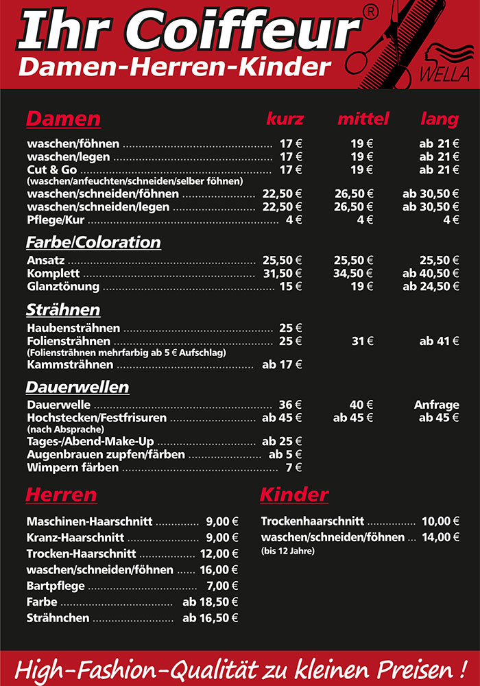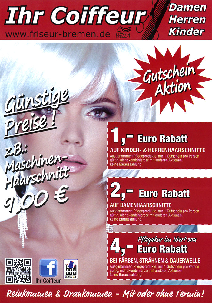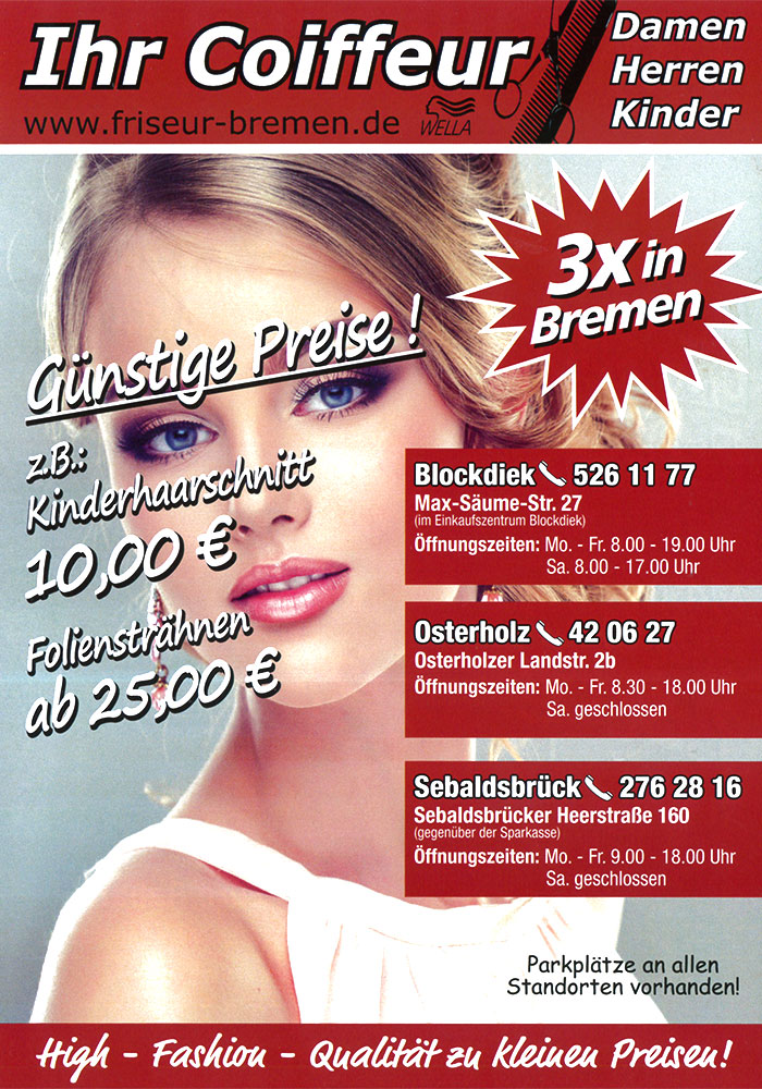 Impressum: Ihr Coiffeur | Inhaberin : Nelli Schreiner | Max-Säume-Strasse 27 | 28327 Bremen | info@friseur-bremen.de | Steuer Nr : 73/256/09324 | Eingetragener Friseur Salon in der Handwerkskammer Bremen.